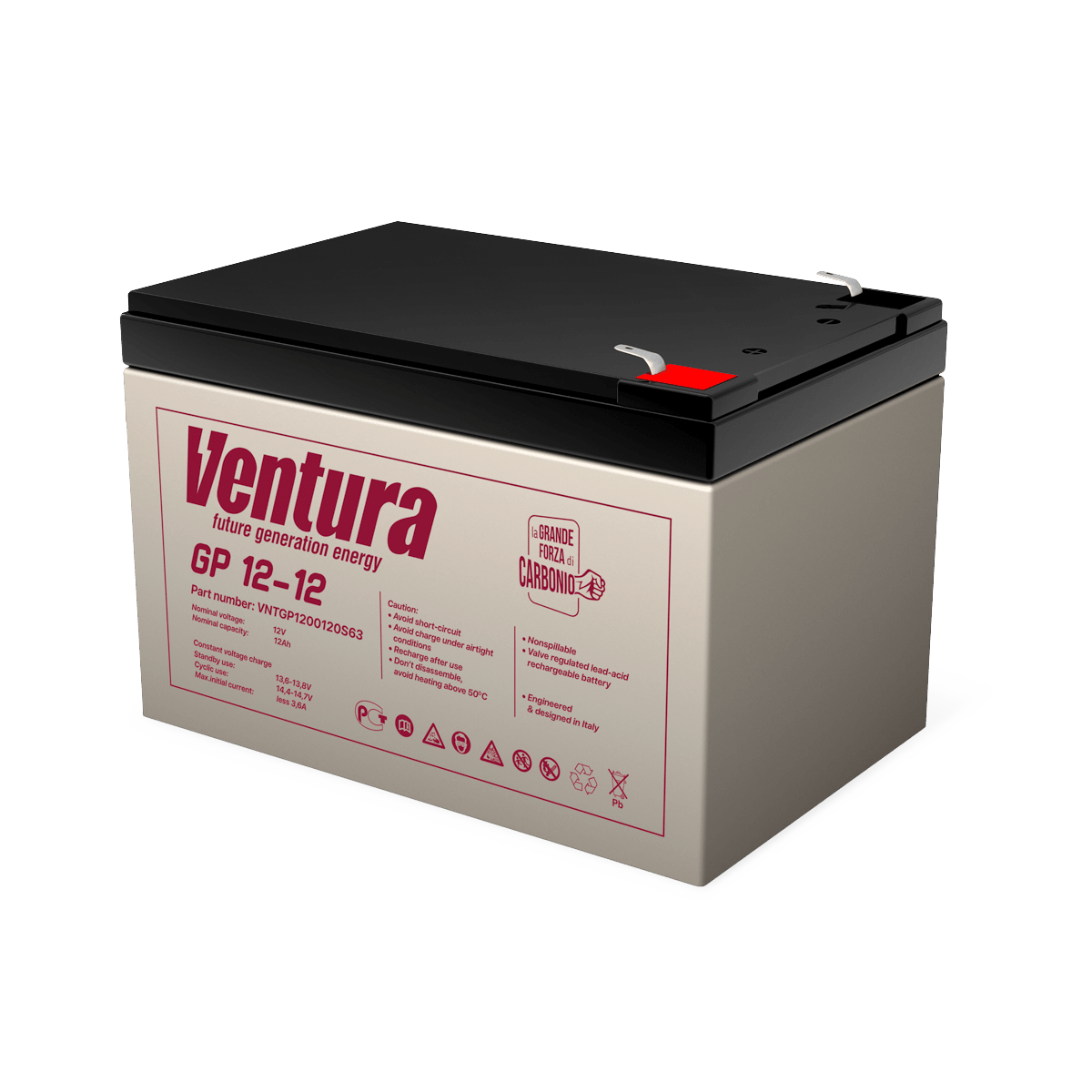 Аккумулятор GP 12-12, Ventura Технология: AGM Номинальная емкость: 12 Ач Номинальное напряжение: 12В Срок службы: 5 Основные характеристики: Технология изготовления Герметизированные свинцово-кислотные аккумуляторы Ventura серии GP изготавливаются по технологии AGM (технология AGM – аккумуляторы с жидким электролитом, впитанным в стекловолоконный сепаратор). Особенности конструкции В аккумуляторах используются намазные положительные и отрицательные пластины. Отличительной особенностью пластин данного типа является простота конструкции, низкое внутреннее сопротивление, быстрое восстановление емкости. Решетки пластин изготовлены из свинцового сплава с улучшенными эксплуатационными характеристиками. Корпуса аккумуляторов изготовлены из высококачественного пластика (ABS-акрилбутадиенстирол). Возможен заказ аккумуляторов с корпусами стандартной (НВ) или повышенной (V0) огнестойкости (стандарт UL94). Технические характеристики Аккумуляторы серии GP производятся в виде моноблоков на номинальное напряжение 6