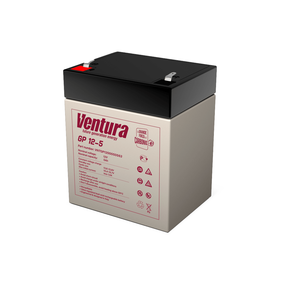 Аккумулятор GP 12-5, Ventura Технология: AGM Номинальная емкость: 5 Ач Номинальное напряжение: 12В Срок службы: 5 Основные характеристики: Технология изготовления Герметизированные свинцово-кислотные аккумуляторы Ventura серии GP изготавливаются по технологии AGM (технология AGM – аккумуляторы с жидким электролитом, впитанным в стекловолоконный сепаратор). Особенности конструкции В аккумуляторах используются намазные положительные и отрицательные пластины. Отличительной особенностью пластин данного типа является простота конструкции, низкое внутреннее сопротивление, быстрое восстановление емкости. Решетки пластин изготовлены из свинцового сплава с улучшенными эксплуатационными характеристиками. Корпуса аккумуляторов изготовлены из высококачественного пластика (ABS-акрилбутадиенстирол). Возможен заказ аккумуляторов с корпусами стандартной (НВ) или повышенной (V0) огнестойкости (стандарт UL94). Технические характеристики Аккумуляторы серии GP производятся в виде моноблоков на номинальное напряжение 6 и