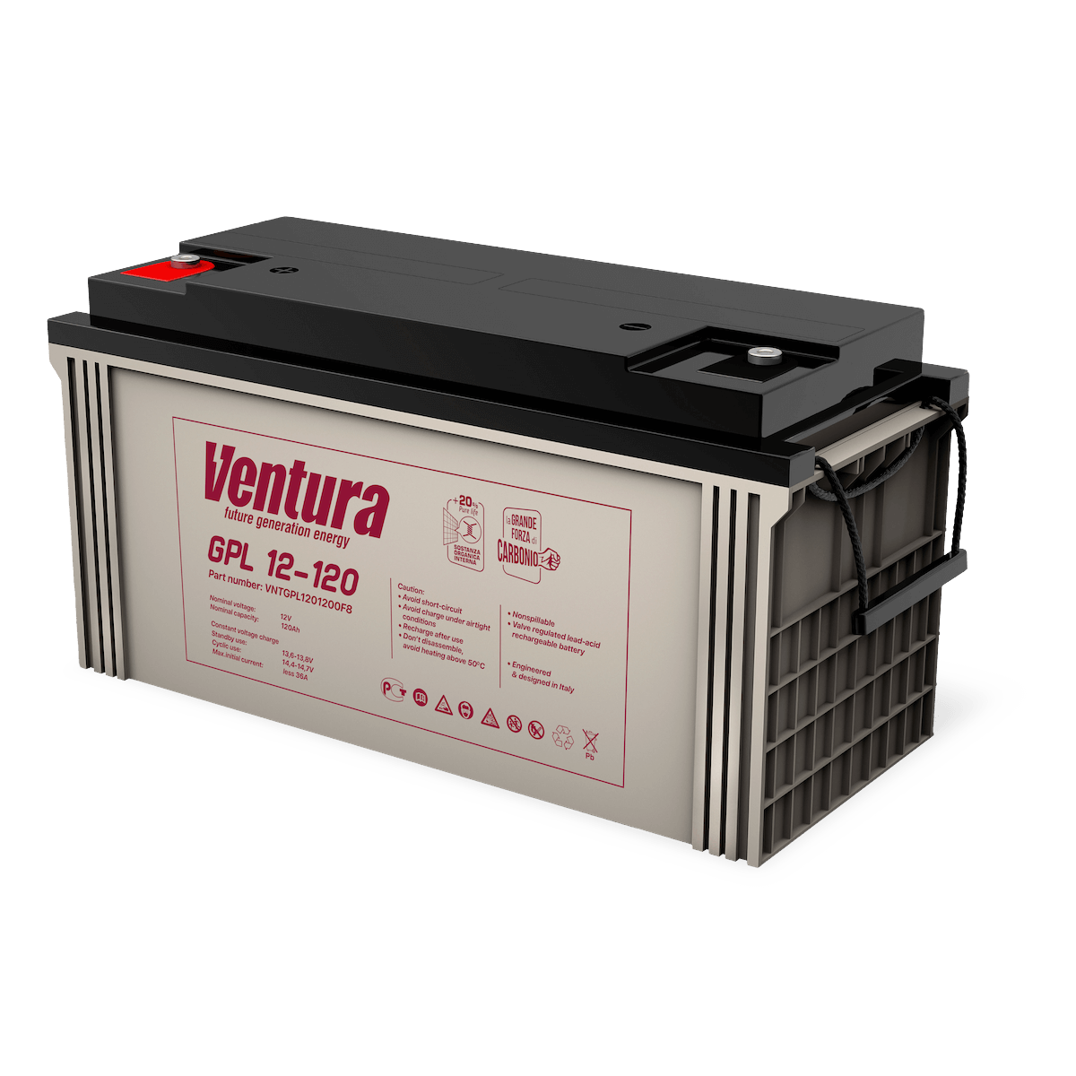Аккумулятор GPL 12-120, Ventura Технология: AGM Номинальная емкость: 120 Ач Номинальное напряжение: 12В Срок службы: 10 лет Основные характеристики: Технология изготовления Герметизированные свинцово-кислотные аккумуляторы Ventura серии GP изготавливаются по технологии AGM (технология AGM – аккумуляторы с жидким электролитом, впитанным в стекловолоконный сепаратор). Особенности конструкции В аккумуляторах используются намазные положительные и отрицательные пластины. Отличительной особенностью пластин данного типа является простота конструкции, низкое внутреннее сопротивление, быстрое восстановление емкости. Решетки пластин изготовлены из свинцового сплава с улучшенными эксплуатационными характеристиками. Корпуса аккумуляторов изготовлены из высококачественного пластика (ABS-акрилбутадиенстирол). Возможен заказ аккумуляторов с корпусами стандартной (НВ) или повышенной (V0) огнестойкости (стандарт UL94). Технические характеристики Аккумуляторы серии GP производятся в виде моноблоков на номинальное напр