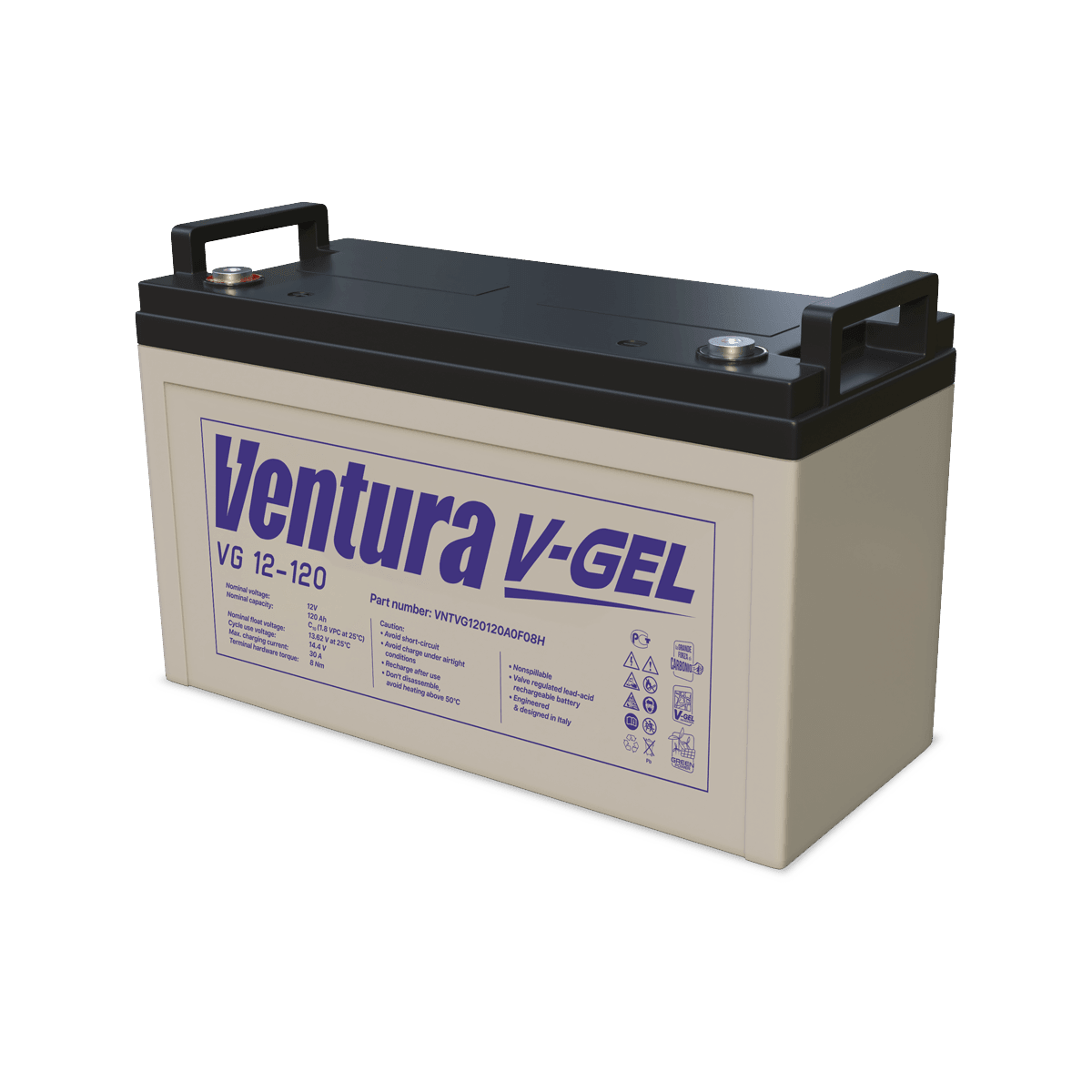 Аккумулятор VG 12-120, Ventura Технология: AGM Номинальная емкость: 120 Ач Номинальное напряжение: 12В Срок службы: 15 лет Основные характеристики: Технология изготовления Герметизированные свинцово-кислотные аккумуляторы Ventura серии GP изготавливаются по технологии AGM (технология AGM – аккумуляторы с жидким электролитом, впитанным в стекловолоконный сепаратор). Особенности конструкции В аккумуляторах используются намазные положительные и отрицательные пластины. Отличительной особенностью пластин данного типа является простота конструкции, низкое внутреннее сопротивление, быстрое восстановление емкости. Решетки пластин изготовлены из свинцового сплава с улучшенными эксплуатационными характеристиками. Корпуса аккумуляторов изготовлены из высококачественного пластика (ABS-акрилбутадиенстирол). Возможен заказ аккумуляторов с корпусами стандартной (НВ) или повышенной (V0) огнестойкости (стандарт UL94). Технические характеристики Аккумуляторы серии GP производятся в виде моноблоков на номинальное напря